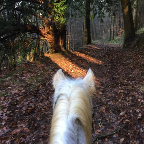The original track down to The Fence (the wood) was extremely rocky with steps formed by the earth washed away from roots, Flicker had to scoot up the bank in places where the shelves were over 3 feet! The ride was going great, we had a couple of jumps made from fallen trees and a few that we had to skirt around and Flicker was really keen. We were enjoying a glorious flat out gallop when we came to a tree in the path which was slightly too big for Flicker to easily move around so I hopped off and held the branches back so that Flix could negotiate safely through.
